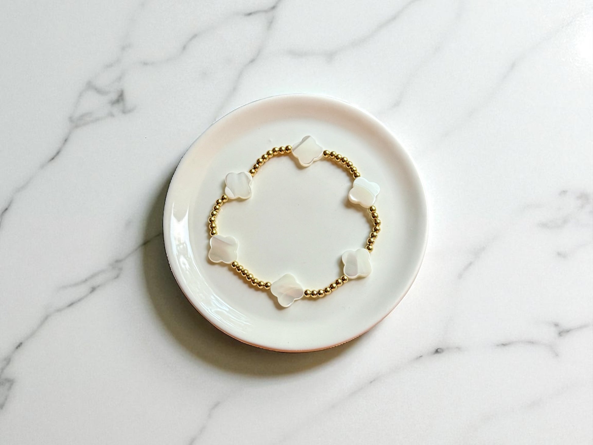 Elegant and timeless, the Augusta Bracelet is the middle sister in our clover trio—nestled perfectly between the bold Alexandra and the classic Sophia. Designed with luminous 12mm mother-of-pearl clovers and 3mm 18K gold-filled beads, Augusta strikes a balance of statement and subtlety, adding effortless polish to any stack.