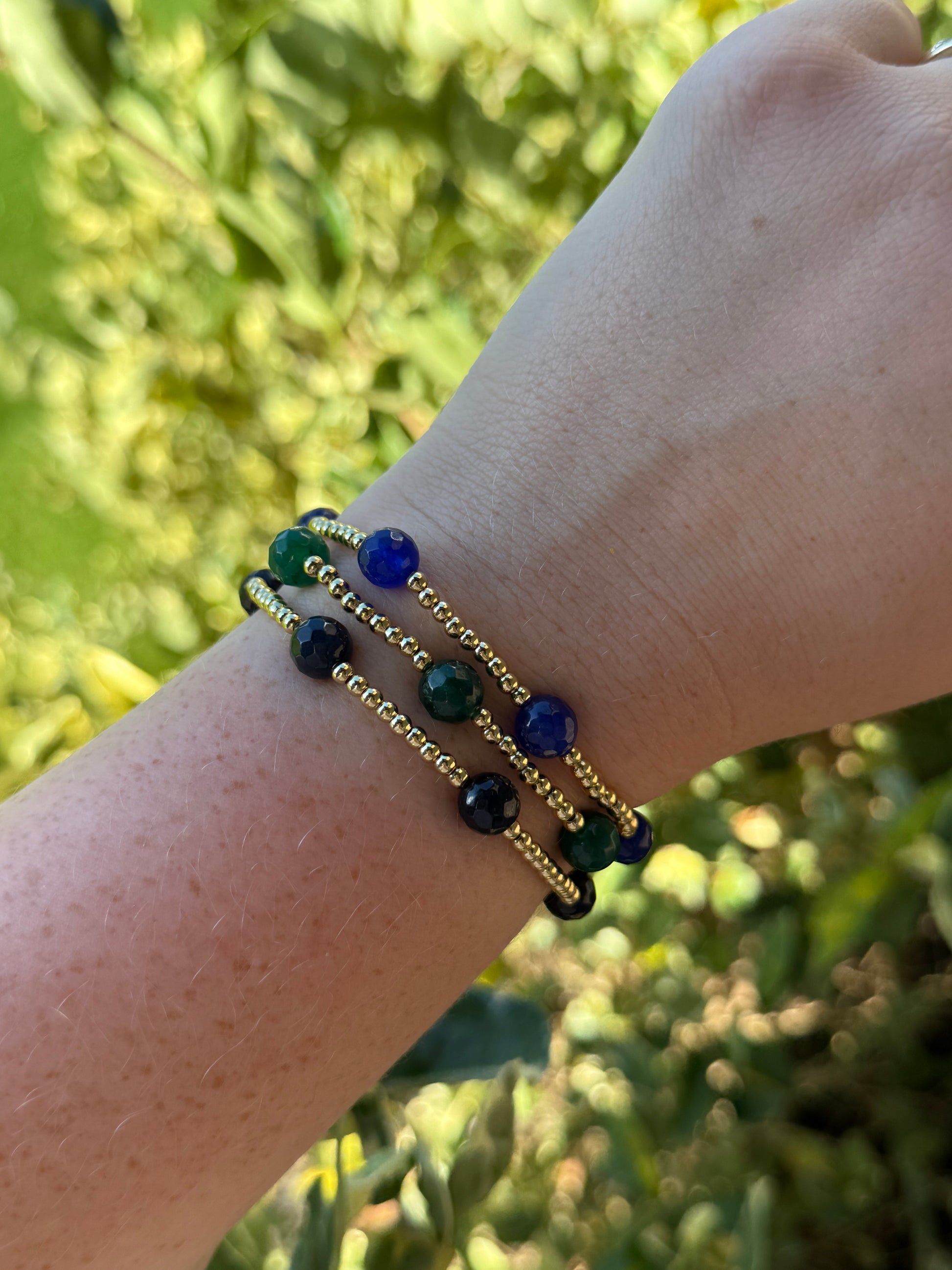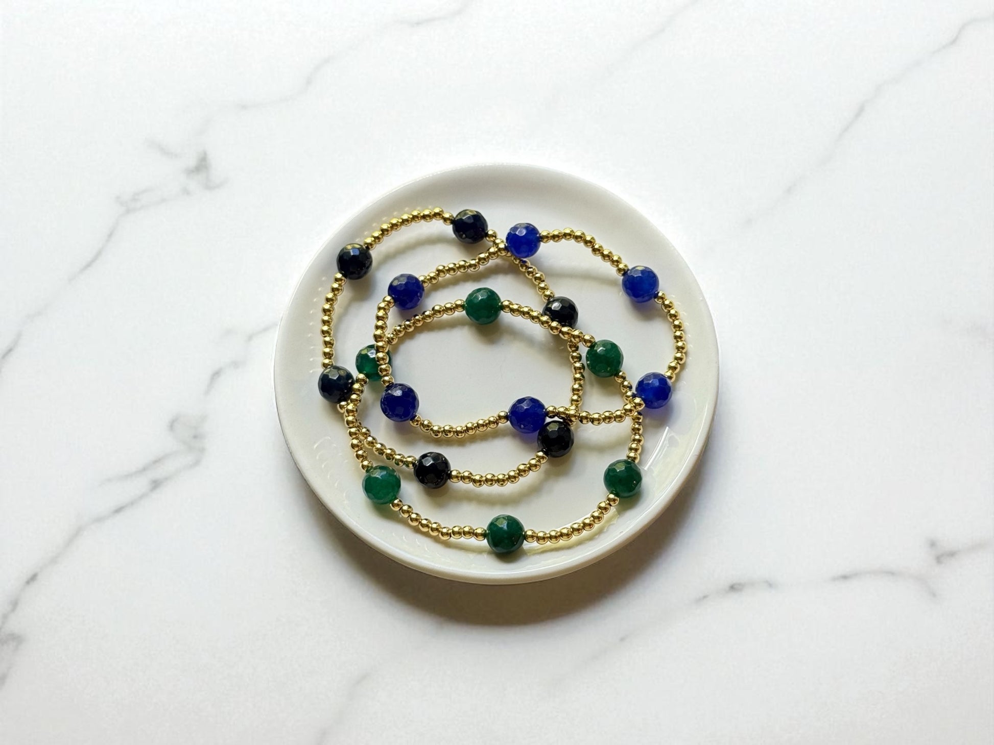The Margaret offers a graceful way to add a pop of color to your stack. Featuring 3mm 18K gold-filled beads and an 8mm faceted stone—choose from blue striped agate, rose quartz, black onyx, navy blue jade, bright blue jade, or emerald green jade—this piece brings a touch of fun and pop of color to any look.