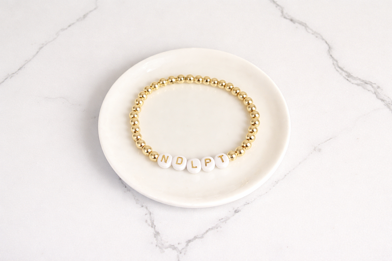 The NDLPT bracelet is a playful favorite, loved by our needlepoint girlies for its easy, everyday wear. Featuring 5mm 18K gold-filled beads and classic letter beads, this piece is both a conversation starter and a perfect stacker—polished, playful, and made to elevate your everyday.