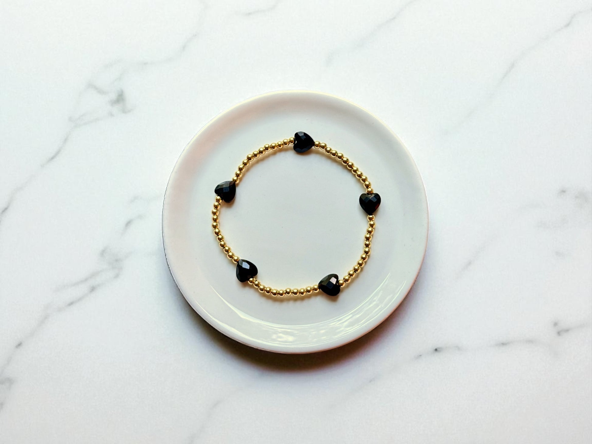 Chic with a hint of edge, the Zara bracelet features faceted black obsidian hearts set between 3mm 18K gold-filled beads. Its sleek contrast and subtle shine make it the perfect piece to elevate your everyday—bold enough to stand alone, timeless enough to stack.